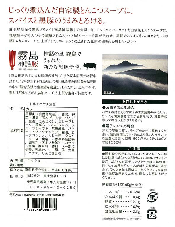 鹿児島県産の黒豚ブランド「霧島神話豚」の角切り肉・とんこつをベースにした自家製とんこつスープに、 経験豊かな職人の手で厳選されたスパイスとカレールーを混ぜ合わせ、黒豚のとろける旨みとコクをたっぷり感じられるカレーに仕上げました。やわらかく煮込まれた豚肉の風味もお楽しみください。