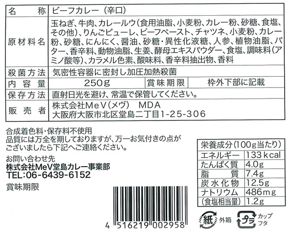 関西を中心に人気の堂島カレー。大入り250g。