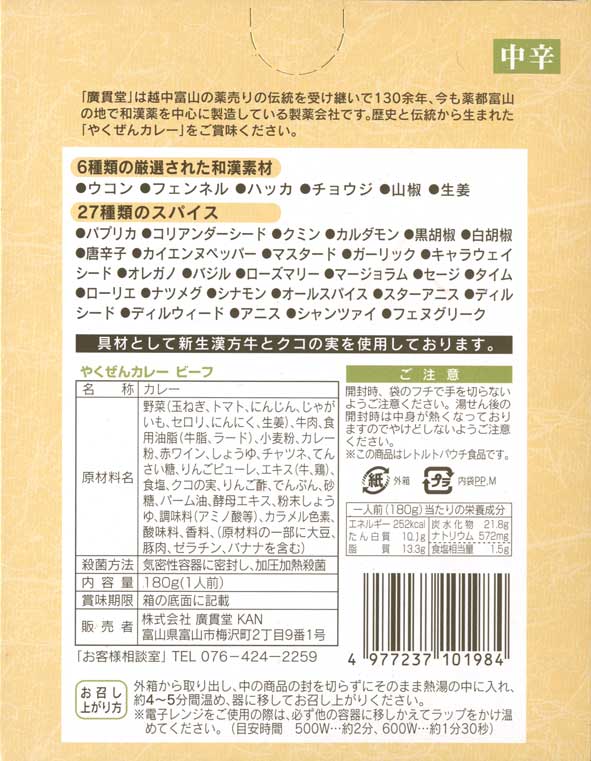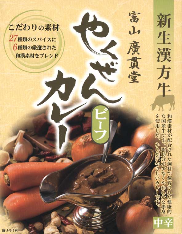 「廣貫堂」は越中富山の薬売りの伝統を受け継いで130余年、今も薬都富山の地で和漢薬を中心に製造している製薬会社です。歴史と伝統から生まれた「やくぜん」カレーをご賞味ください。
