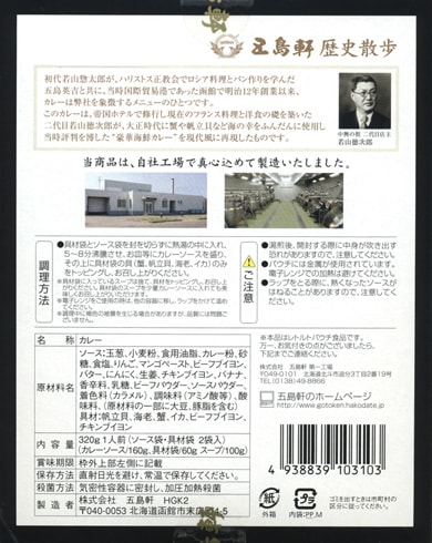 初代若山惣太郎が、ハリストス正教会でロシア料理とパン作りを学んだ五島英吉と共に、当時国際貿易港であった函館で明治12年創業以来、カレーは弊社(五島軒)を象徴するメニューのひとつです。このカレーは、帝国ホテルで修業し現在のフランス料理と洋食の礎を築いた二代目若山徳次郎が、大正時代に蟹や帆立貝など海の幸をふんだんに使用し当時評判を博した“豪華海鮮カレー”を現代風に再現したものです。